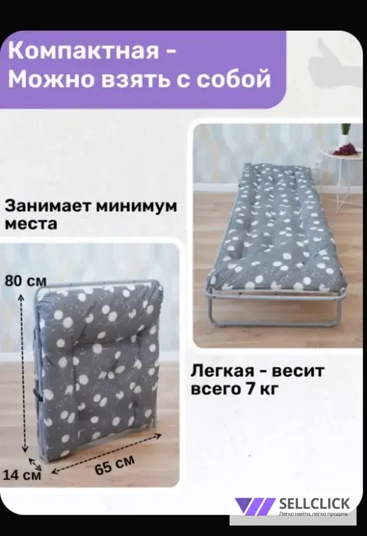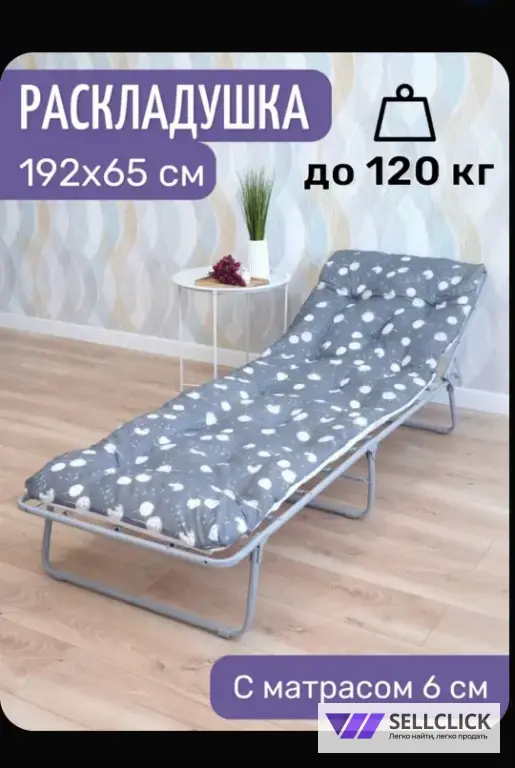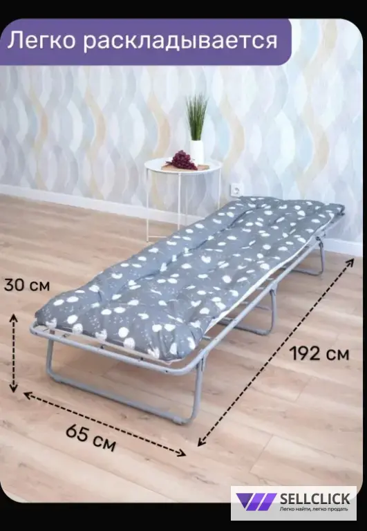 Складная раскладушка с матрацем. Размеры, длина спального места 192 см, ширина 63 см, высота 30 см. Матрац полностью обеспечивает комфорт и поддержку во время сна.Компактно складывается для удобства хранения и транспортировки.