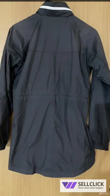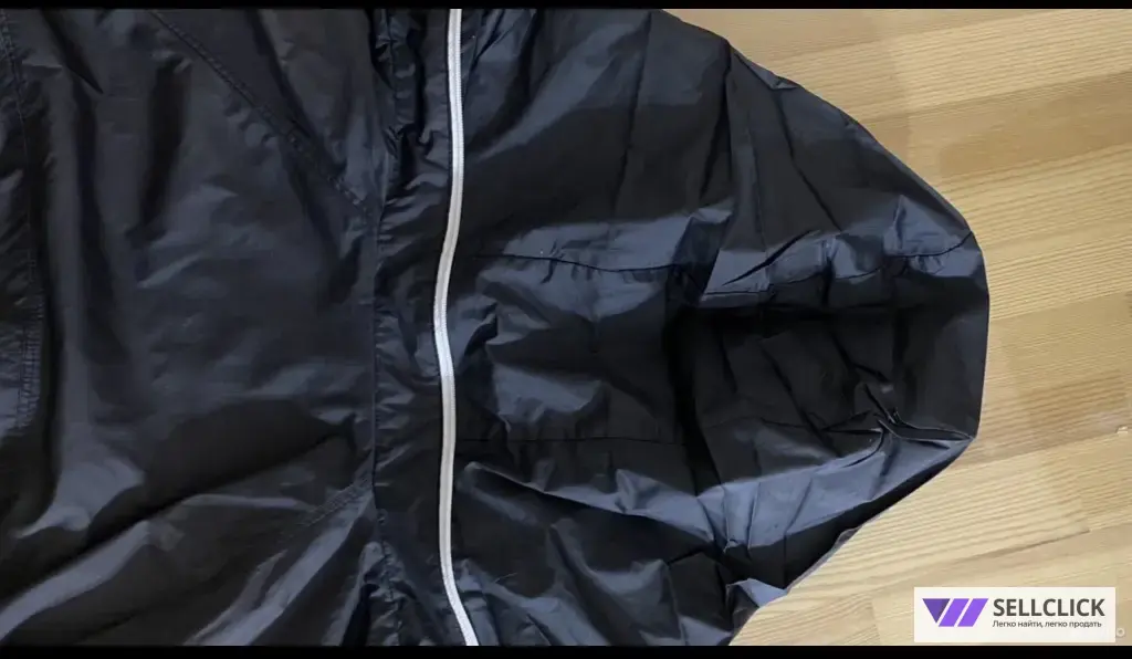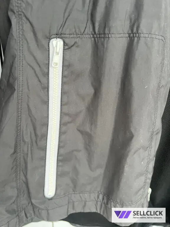 Ветровка очень легкая, дышит. Никаких затяжек, дыр, ничего нет. Состояние прекрасное, но немного под выгорел черный цвет и поэтому он иногда переходит в темно коричневый. Но визуал от этого не портится.