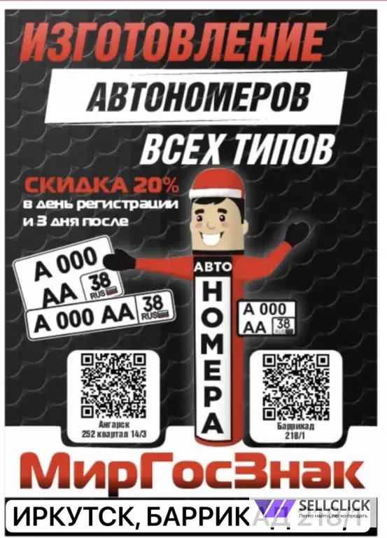 Скидка 20% в день регистрации Тс в ГИБДД, Скидка 20% именинникам за 3 дня и 3 дня после дня рождения, Скидки не суммируются. НАХОДИМСЯ В ИРКУТСКЕ,, За комплект любых номеров действуют скидки. Качественные номера, наши курьеры оперативно доставят в любую точку города.* Российские обычные номера, с флагом - 1200руб. (2200 руб комплект)* Без флага - 1300 руб. (2500руб комплект)* Прицеп - 1200р.Тип 1А Российский гост с флагом 1500₽(комплект 2800₽) размер пластины 290*170.Без флага 1800₽ размер пластины (комплект 3300р) 290*170* Нового образца Тип - 1А с флагом для авто (Америка/Япония) - 2200руб. (Комплект 3800₽) размеры пластины 330*165.* Нового образца Тип - 1А без флага для авто (Америка/Япония) - 2300руб. (Комплект 4000₽). * Мото номера - 2000руб. НАХОДИМСЯ ПО АДРЕСУ г. ИРКУТСК ,Баррикад 88/1, Звоните, пишите , 24 часа. Имеются мессенджеры. ОТПРАВИМ В ЛЮБОЙ РЕГИОН ПОЧТОЙ РОССИИ. скидки не суммируются, Жирный шрифт изготавливаем в Иркутске, Лаковые , жирный шрифт,изготовление гос номеров, жирный шрифт номеров, дубликаты номеров, дубликаты гос номеров,дубликаты номеров официально, дубликат гос номера, дубликат номера автомобиля,сделать дубликат номеров,изготовление дубликатов номеров,дубликат номеров цена, изготовление дубликатов гос номеров, жирный шрифт, дубликат номеров на машину.