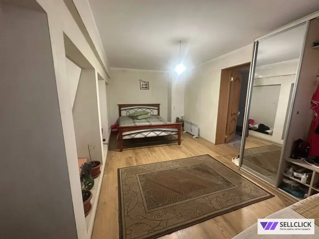 В доме большая кухня, 3 комнаты, одна на первом этаже, и две на втором.
