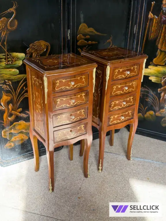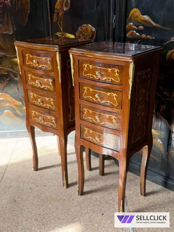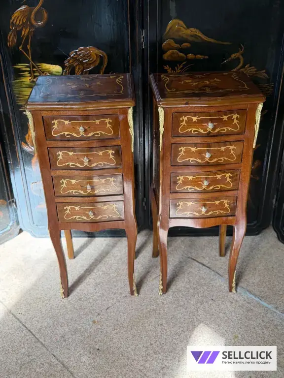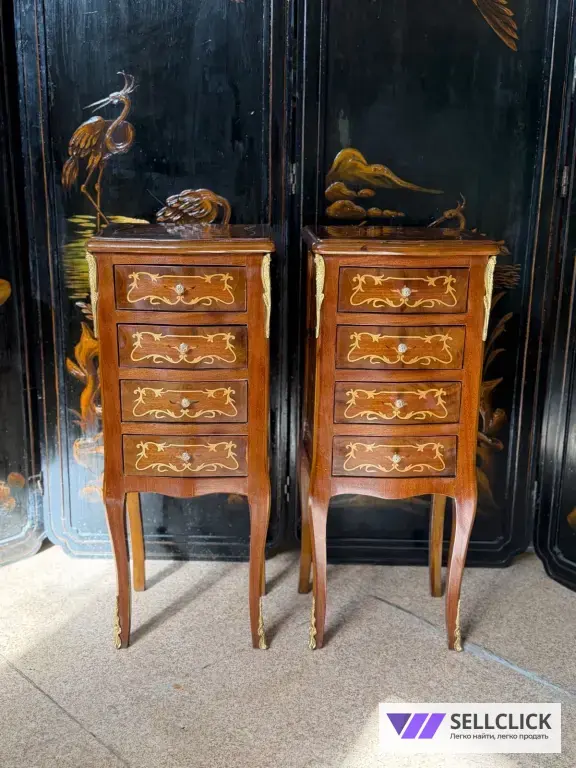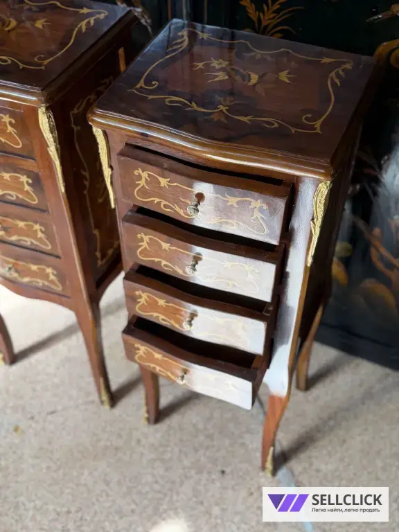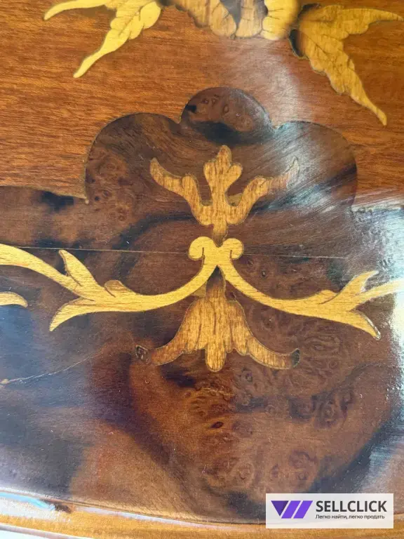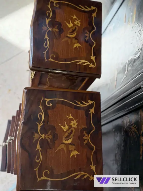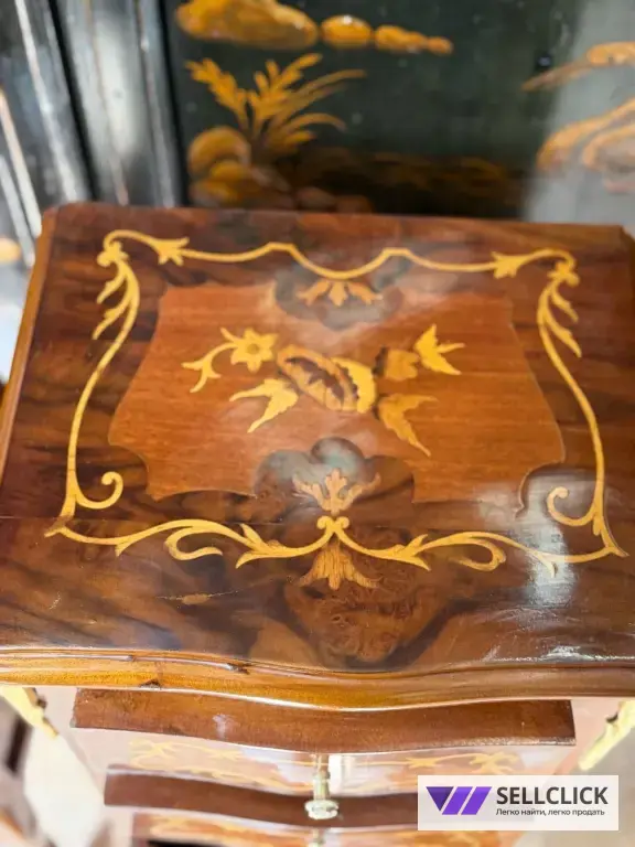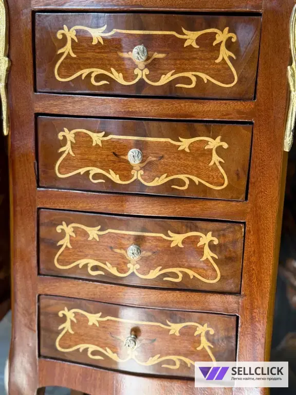 Винтажная комод с изящной маркетри, выполненный из дерева и шпона. Этот элегантный предмет мебели станет украшением любого интерьера благодаря своему уникальному дизайну. Комод имеет четыре вместительных ящика, которые обеспечивают удобное хранение вещей. Состояние хорошее, без видимых дефектов