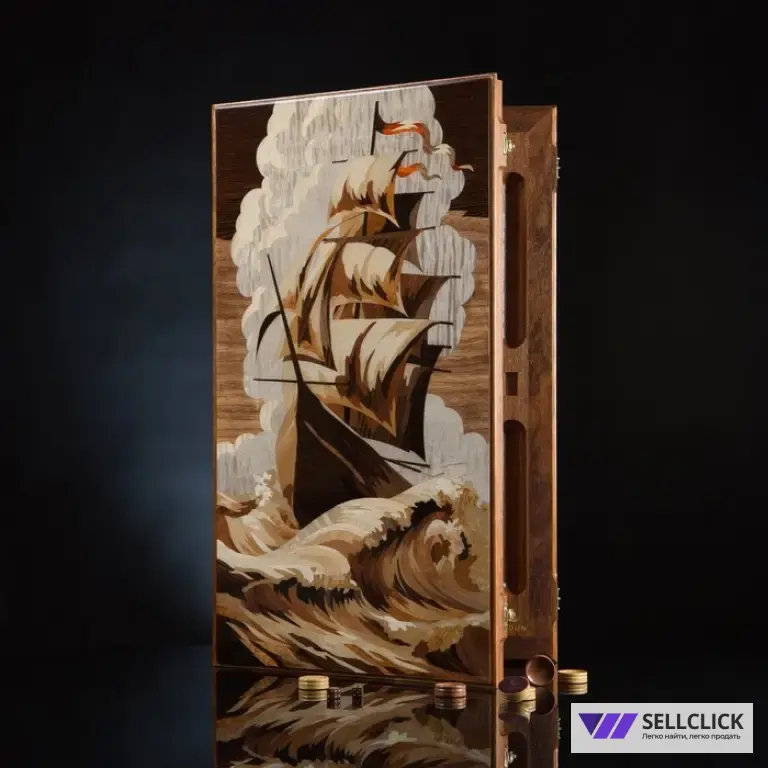 Нарды «Летучий голландец» несут дух морской стихии. Бушующие волны; ветер, готовый сорвать мачты, и уверенная стойкость корабля — всё это выполнено в технике маркетри на лицевой стороне набора и покрыто благородным рояльным лаком.