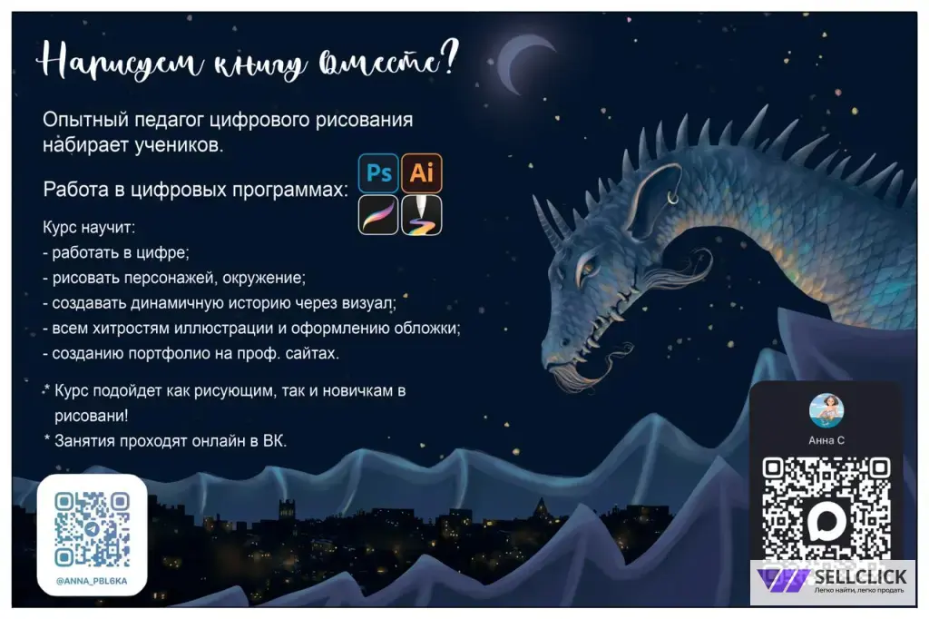 Я - цифровой иллюстратор с опытом преподавания, провожу онлайн-уроки в программах Photoshop, Illustrator и Procreate/GoPain.